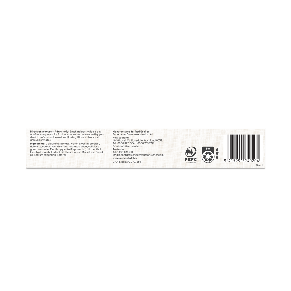 Calcium carbonate, water, glycerin, sorbitol, dolomite, sodium lauryl sulfate, hydrated silica, cellulose gum, bentonite, Mentha piperita (Peppermint) oil, menthol, Eucalyptus globulus leaf oil, Illicium verum (Anise) fruit/seed oil, sodium saccharin, Totarol.
