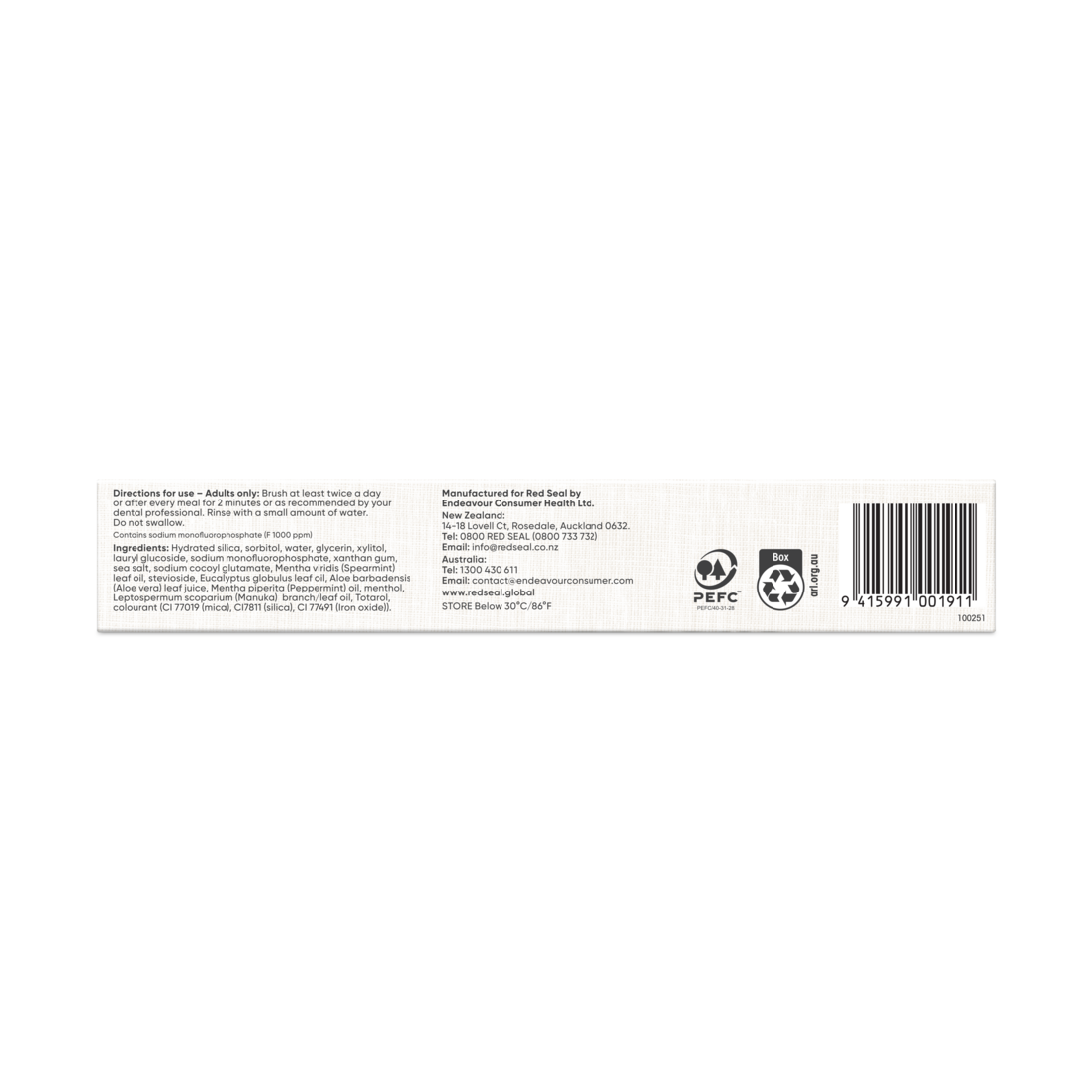 Hydrated silica, sorbitol, water, glycerin, xylitol, lauryl glucoside, sodium monofluorophosphate, xanthan gum, sea salt, sodium cocoyl glutamate, Mentha viridis (Spearmint) leaf oil, stevioside, Eucalyptus globulus leaf oil, Aloe barbadensis (Aloe vera) leaf juice, Mentha piperita (Peppermint) oil, menthol, Leptospermum scoparium (Manuka) branch/leaf oil, Totarol, colourant (mica (CI 77019), silica, CI 77491 (iron oxide red).