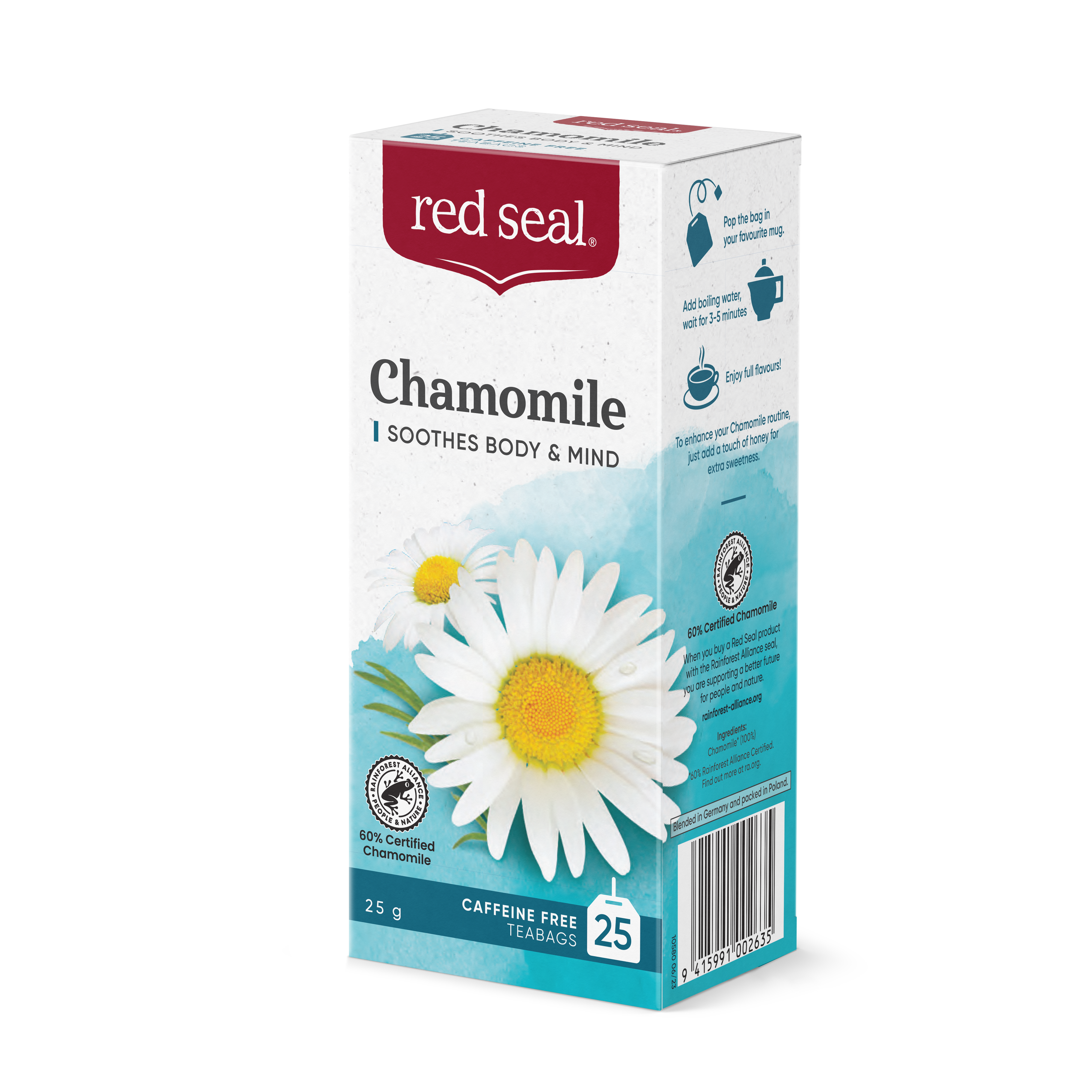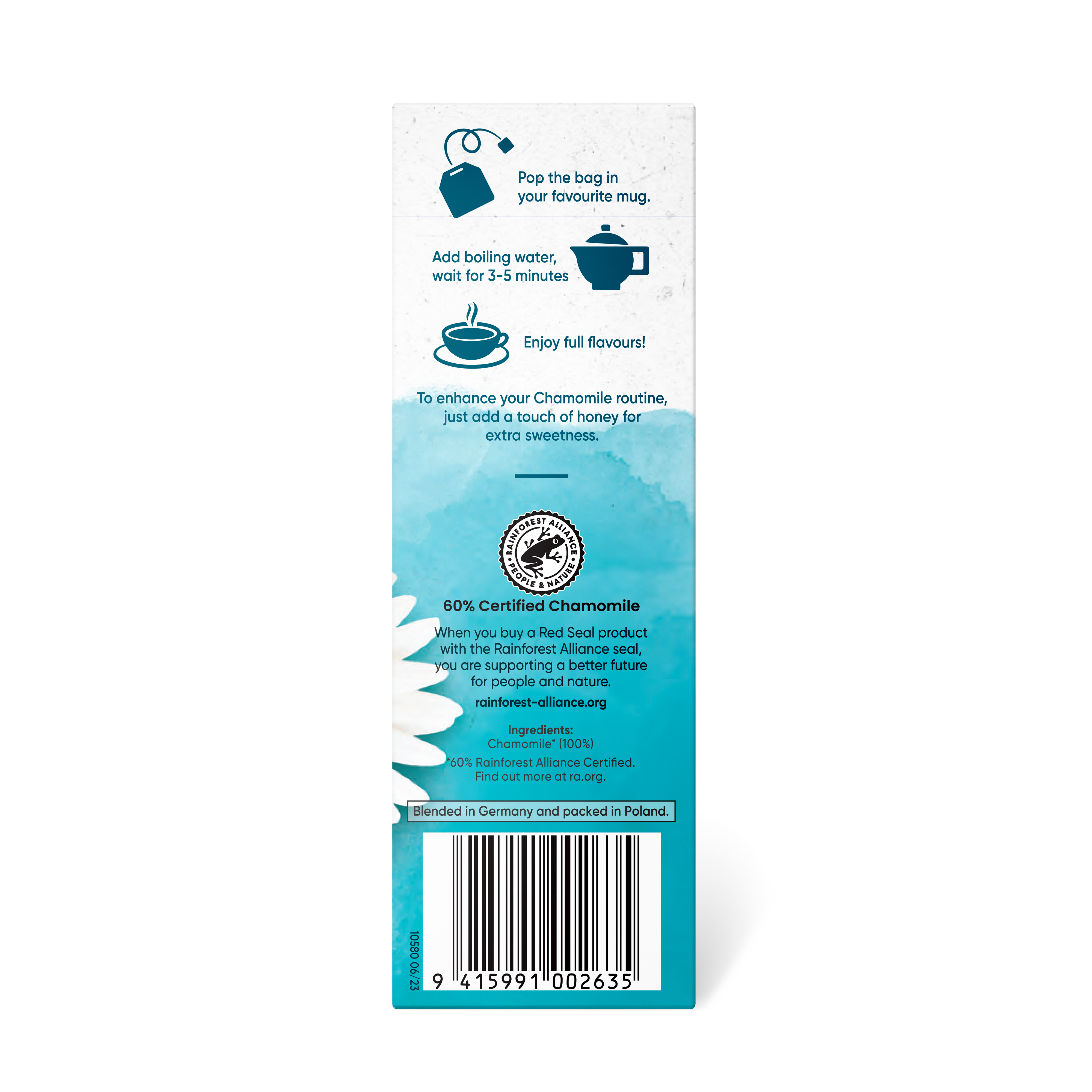 Place the bag in your favourite cup. Add boiling water and in 3-5 minutes you'll achieve maximum extraction and enjoyment. To enhance your Chamomile routine, just add a touch of honey for extra sweetness.