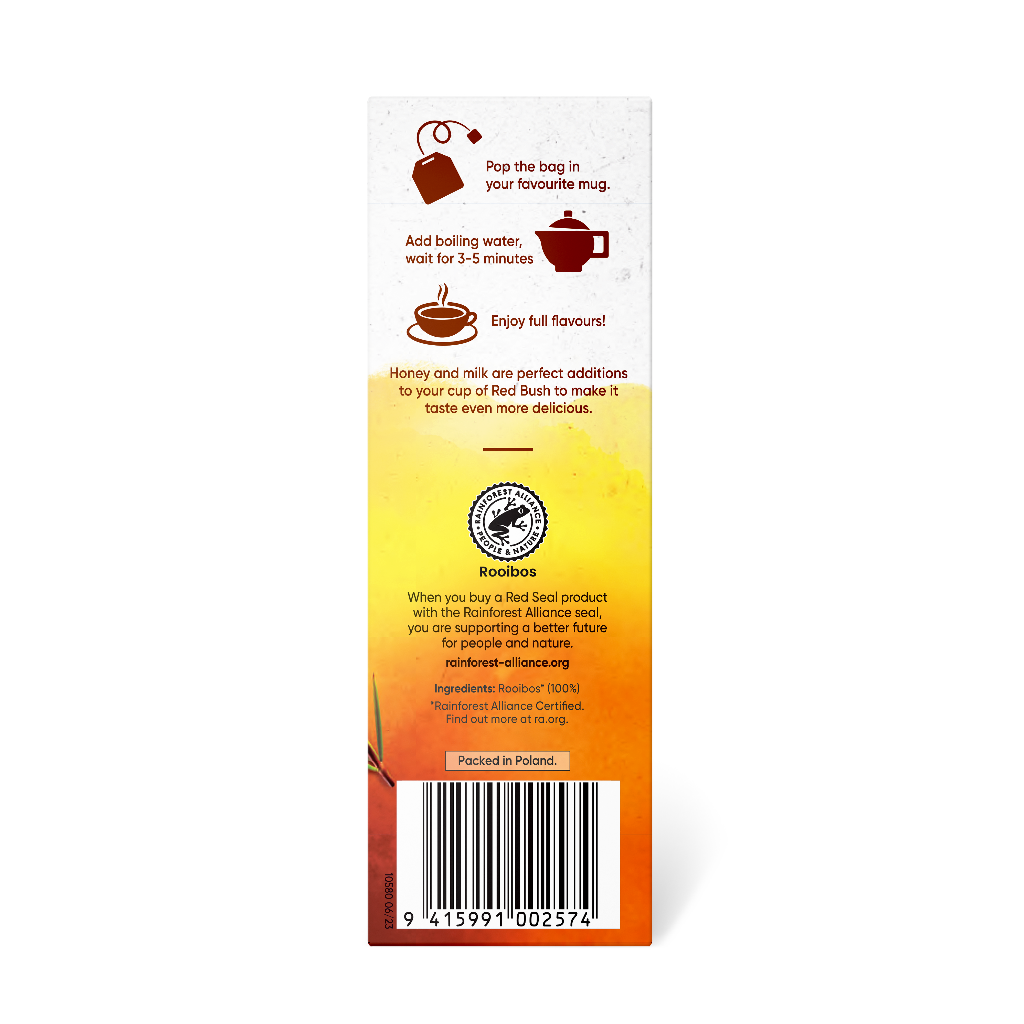 Place the bag in your favourite cup. Add boiling water and in 3-5 minutes you'll achieve maximum extraction and enjoyment. Honey or milk are perfect additions to your cup of Red Bush to make it taste even more delicious.