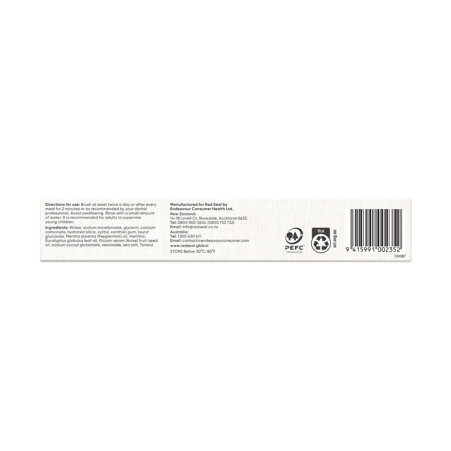 Water, sodium bicarbonate, glycerin, calcium carbonate, hydrated silica, xylitol, xanthan gum, lauryl glucoside, Mentha piperita (Peppermint) oil, menthol, Eucalyptus globulus leaf oil, Illicium verum (Anise) fruit/seed oil, sodium cocoyl glutamate, stevioside, sea salt, Totarol.