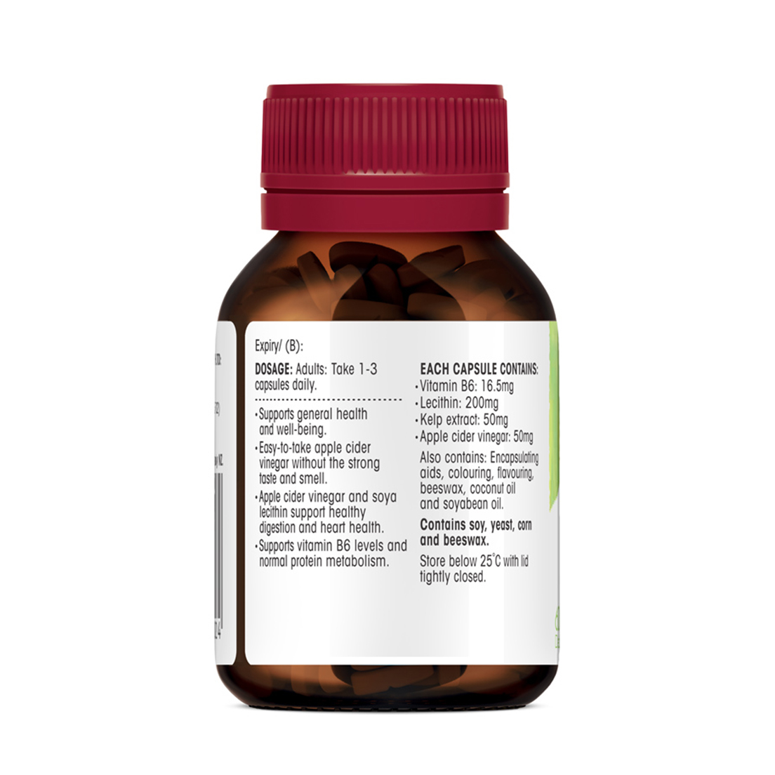 EACH CAPSULE CONTAINS: Vitamin B6: 16.5 mg Lecithin: 200 mg Kelp extract: 50 mg Apple cider vinegar: 50 mg Also contains: Encapsulating aids, colouring, flavouring, beeswax, coconut oil and soybean oil No added preservatives Contains soy, yeast, corn and beeswax.