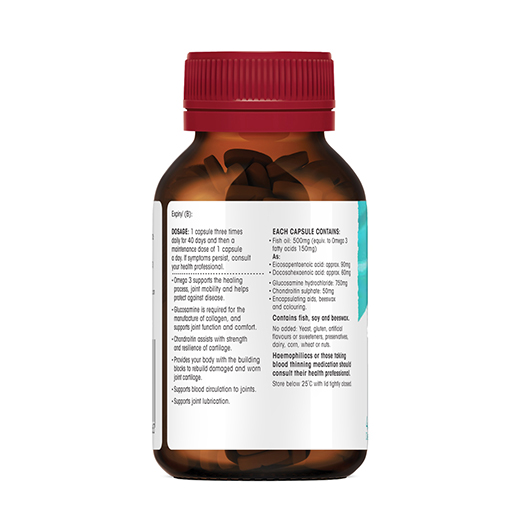 EACH CAPSULE CONTAINS: Fish oil: 500mg (equiv. to Omega 3 fatty acids 150mg) As: Eicosapentaenoic acid: approx. 90mg Docosahexaenoic acid: approx. 60mg Glucosamine hydrochloride: 750mg Chondroitin sulphate: 50mg Encapsulating aids, beeswax and colouring.