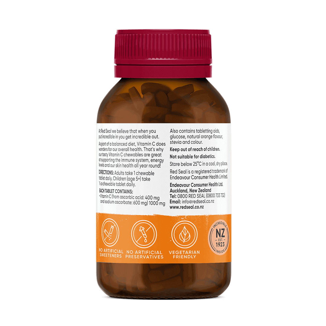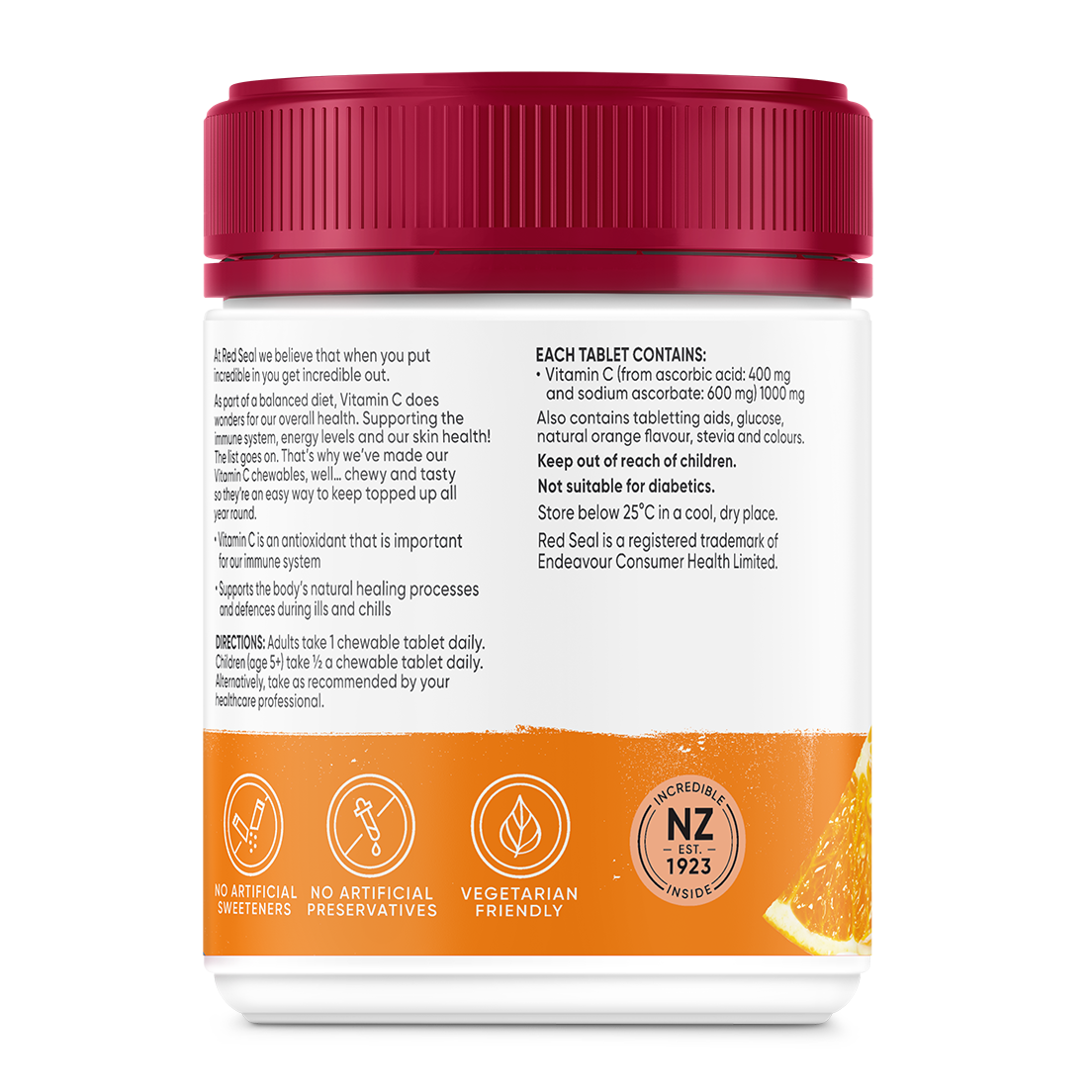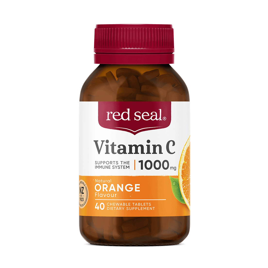 Red Seal 1000mg Vitamin C chewable tablets with orange flavour contains antioxidant support for the body's immune defences.
