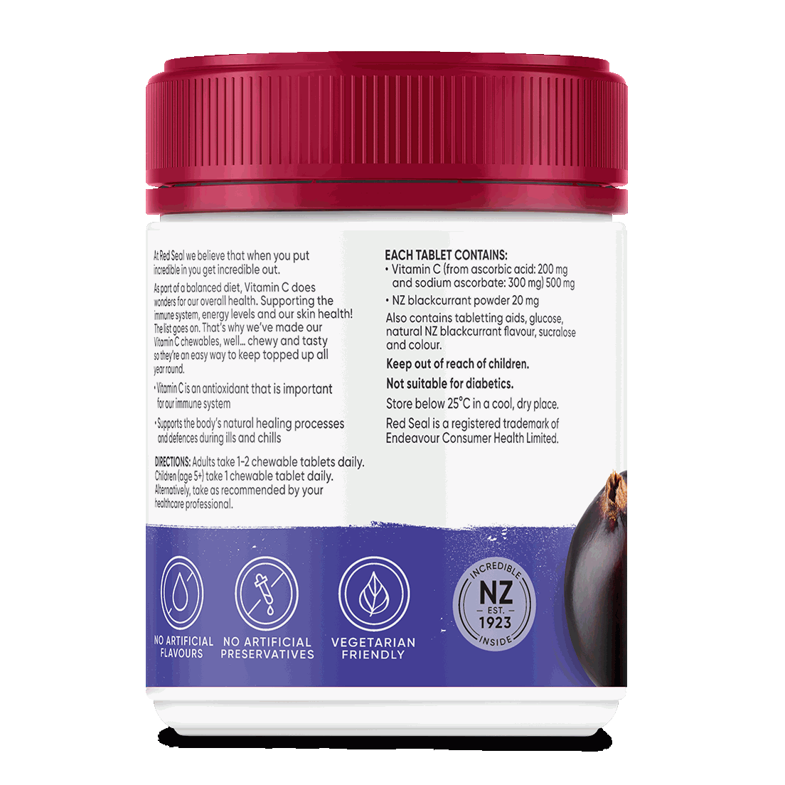 Red Seal 500mg Vitamin C chewable tablets with NZ Blackcurrant, contains antioxidant support for the body's immune defences.