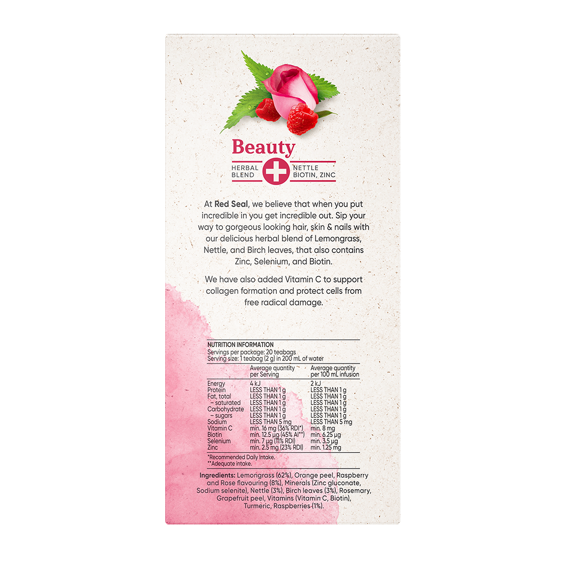 Lemongrass (62%), Orange peel, Raspberry and Rose flavouring (8%), Minerals (Zinc gluconate, Sodium selenite), Nettle (3%), Birch leaves (3%), Rosemary, Grapefruit peel, Vitamins (Vitamin C, Biotin), Turmeric, Raspberries (1%)