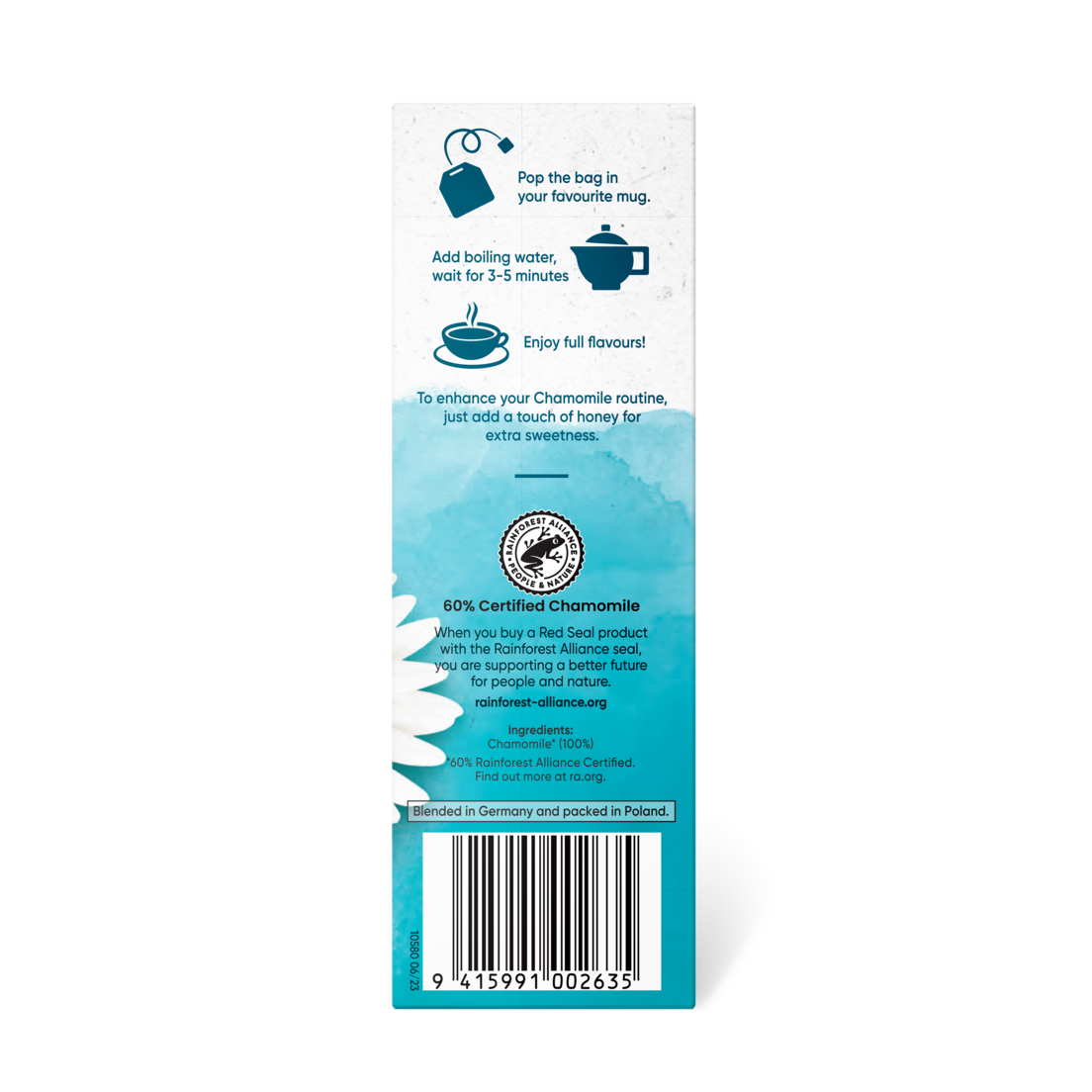 Place the bag in your favourite cup. Add boiling water and in 3-5 minutes you'll achieve maximum extraction and enjoyment. To enhance your Chamomile routine, just add a touch of honey for extra sweetness.