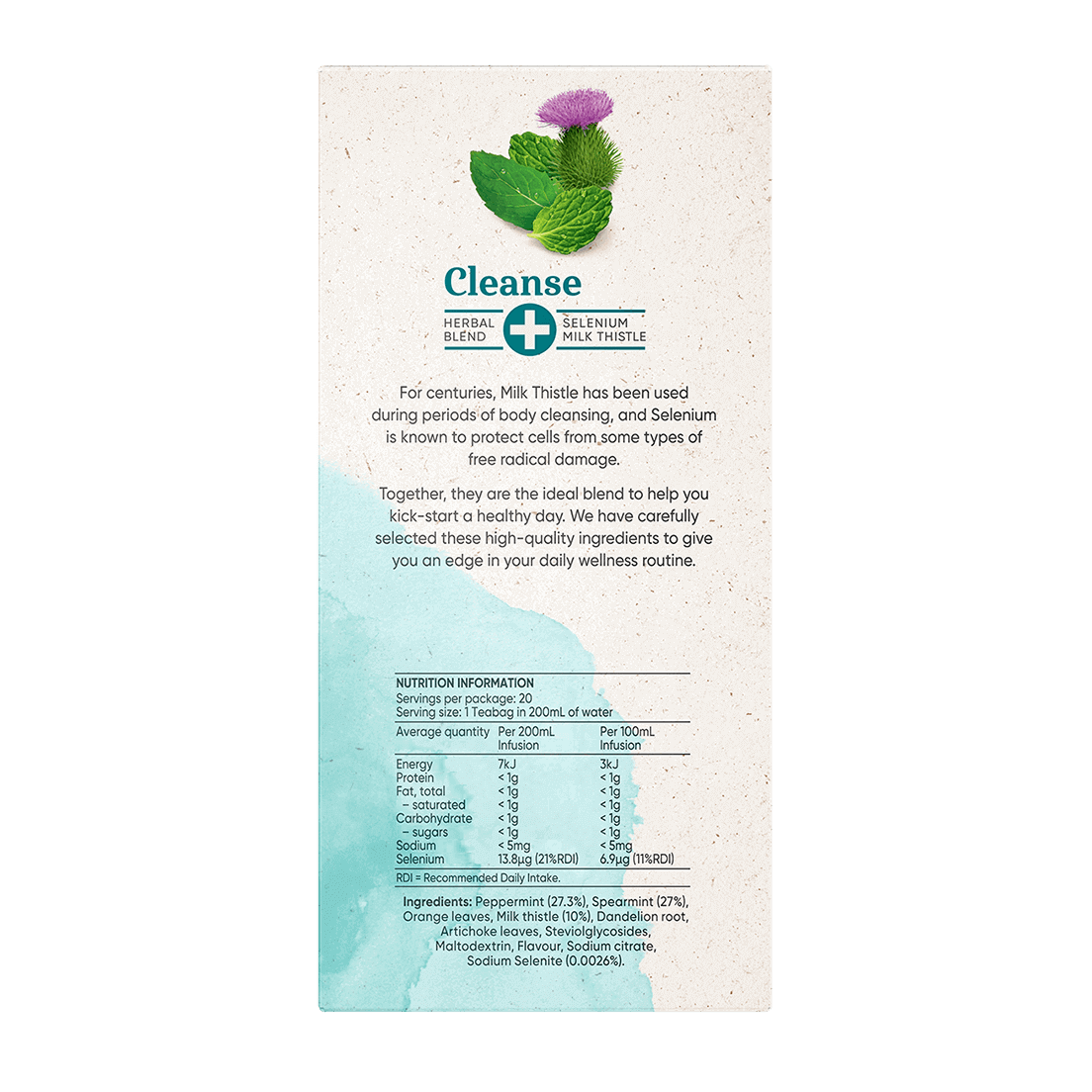 Cleanse contains Milk Thistle and Selenium. If you're taking any prescription medicines, consult your doctor before brewing. Not recommended for expectant mums or children.