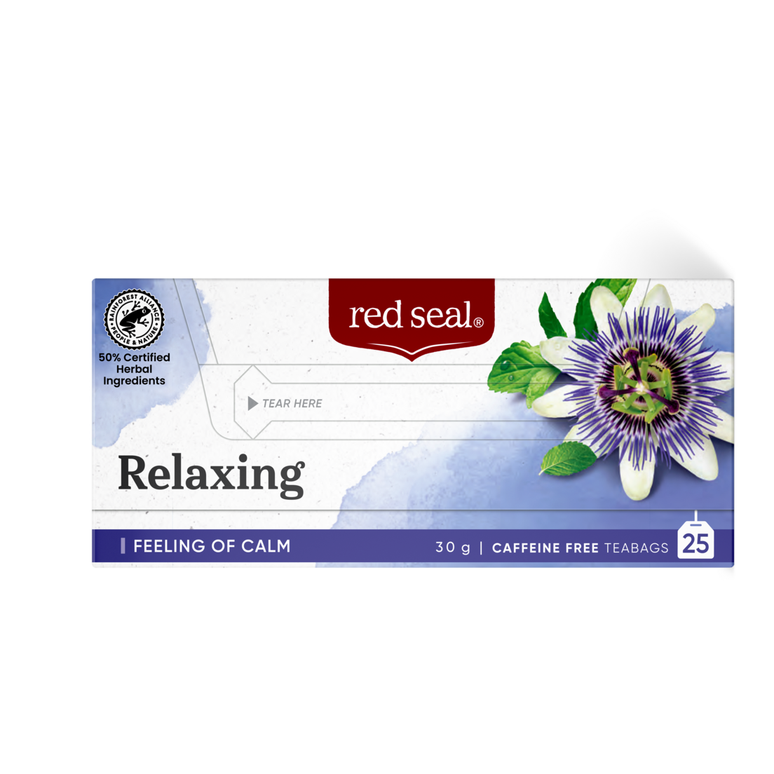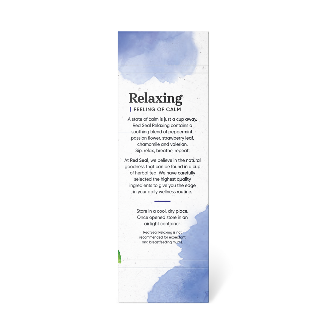 A state of calm is just a cup away. Red Seal Relaxing brew contains a soothing blend of peppermint, passion flower, strawberry leaf, chamomile and valerian. Sip, relax, breathe, repeat.