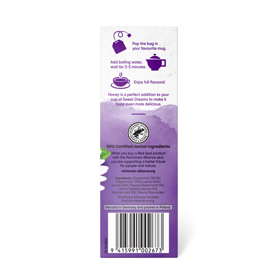 Place the bag in your favourite cup. Add boiling water and in 3-5 minutes you'll achieve maximum extraction and enjoyment. Honey is a perfect addition to your cup of Sweet Dreams to make it taste even more delicious.