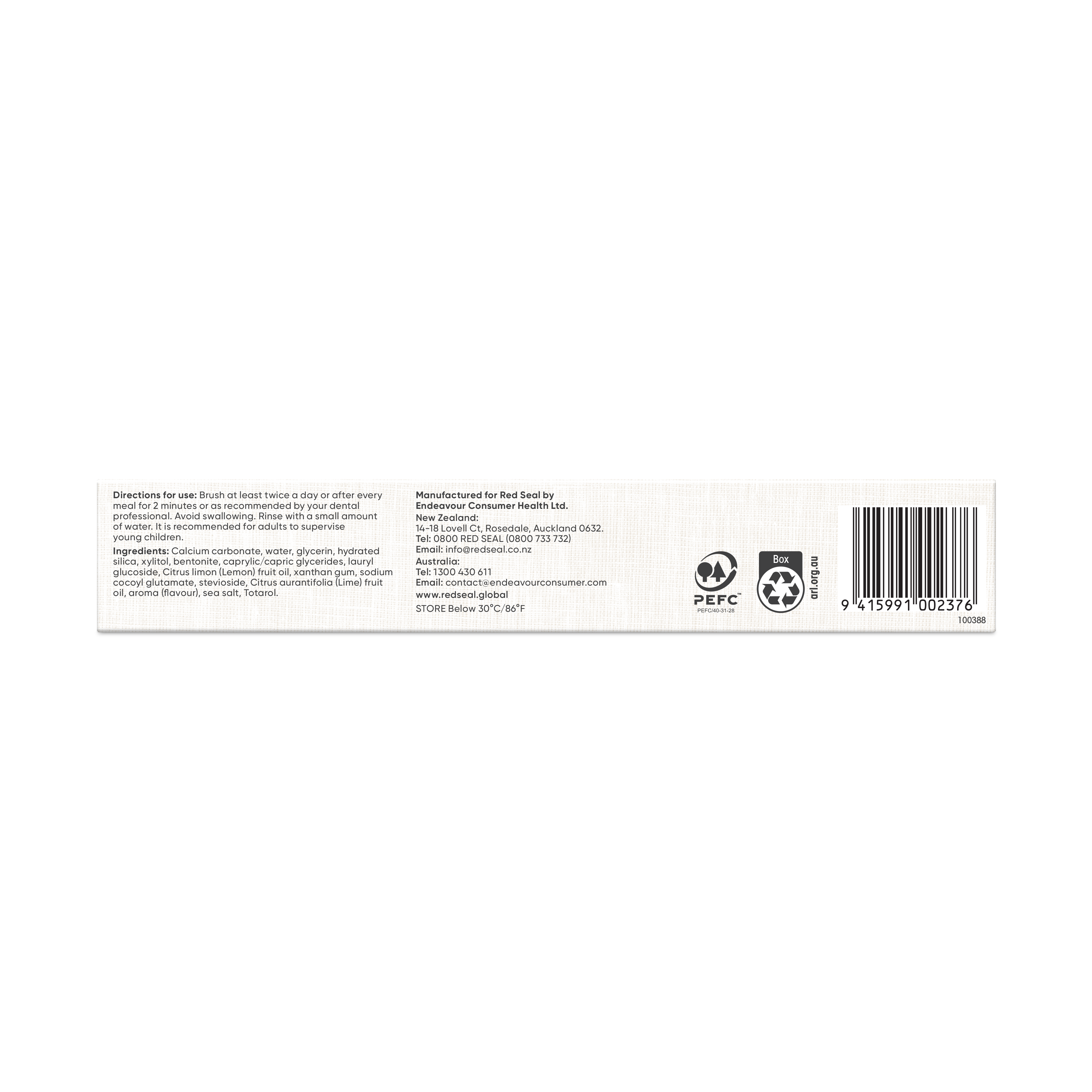 Calcium carbonate, water, glycerin, hydrated silica, xylitol, bentonite, caprylic/capric glycerides, lauryl glucoside, Citrus limon (Lemon) fruit oil, xanthan gum, sodium cocoyl glutamate, stevioside, Citrus aurantifolia (Lime) fruit oil, aroma (flavour), sea salt, Totarol.