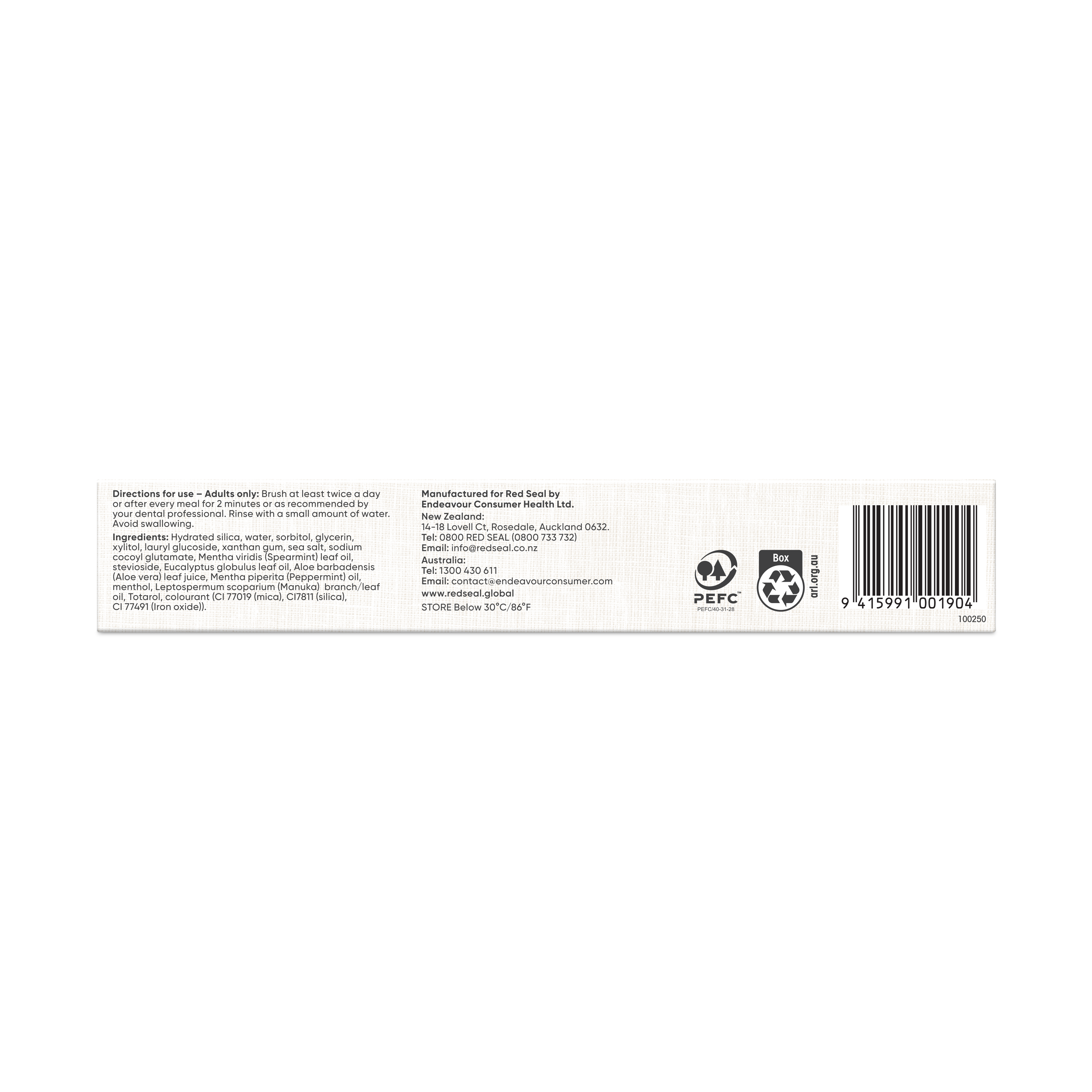 Hydrated silica, water, sorbitol, glycerin, xylitol, lauryl glucoside, xanthan gum, sea salt, sodium cocoyl glutamate, Mentha viridis (Spearmint) leaf oil, stevioside, Eucalyptus globulus leaf oil, Aloe barbadensis (Aloe vera) leaf juice, Mentha piperita (Peppermint) oil, menthol, Leptospermum scoparium (Manuka) branch/leaf oil, Totarol, colourant (mica (CI 77019), silica, CI 77491 (iron oxide red).